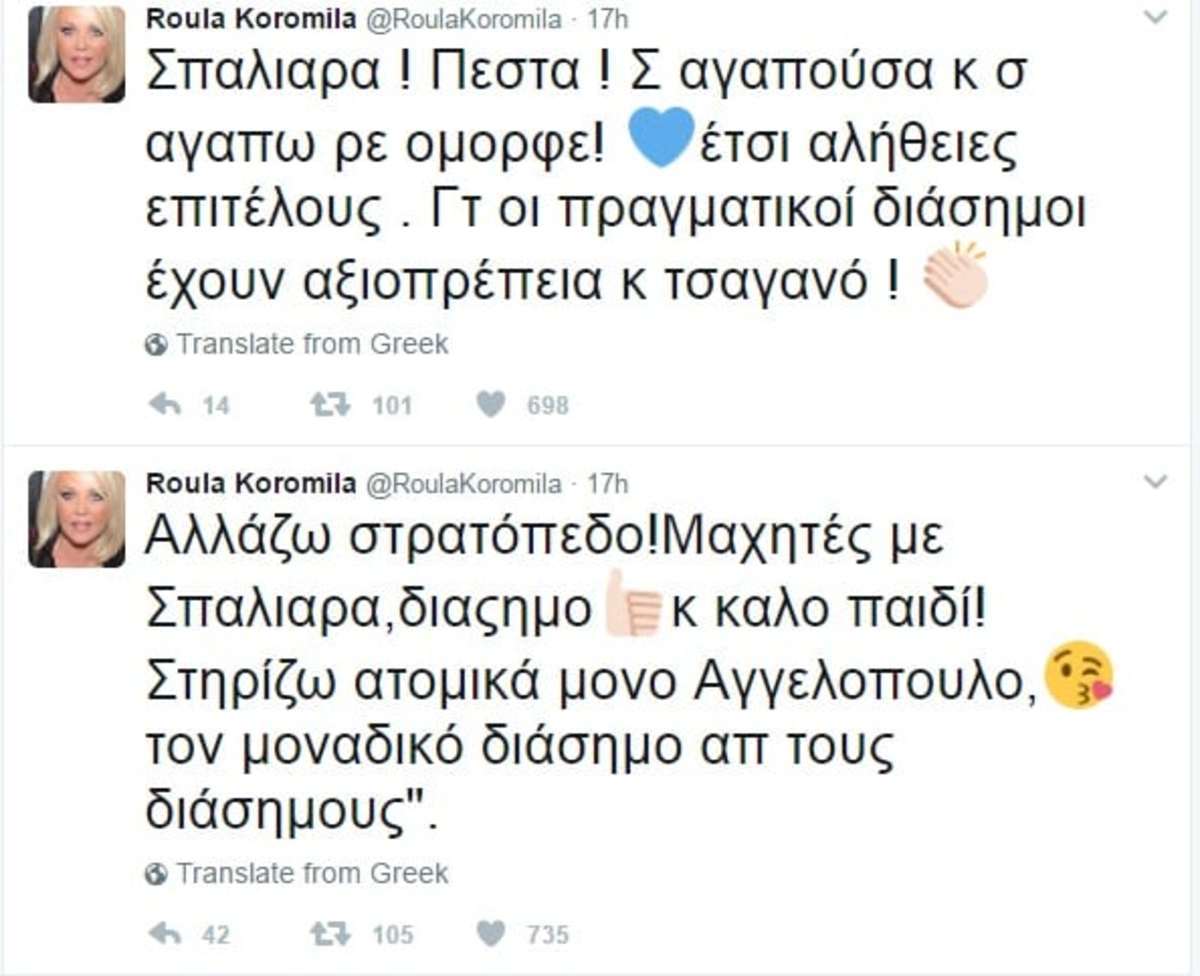 Πρόσωπο των ημερών ο Γιάννης Σπαλιάρας μετά τη αναγκαστική μετακίνηση του μέσω ψηφοφορίας από τους «Διάσημους» στους «Μαχητές» του Survivor, αλλά και με τις αυθόρμητες αντιδράσεις του για αυτό. Η Ρούλα Κορομηλά παρακολουθώντας το χθεσινό επεισόδιο του Survivor τάχθηκε υπέρ του Γιάννη Σπαλιάρα για τις αλήθειες του και του Γιώργου Αγγελόπουλου, τον οποίο αναγνωρίζει ως το μοναδικό διάσημο στην ομάδα των «Διασήμων», γράφοντας: